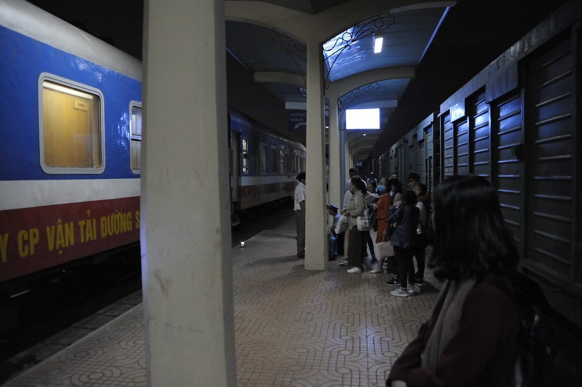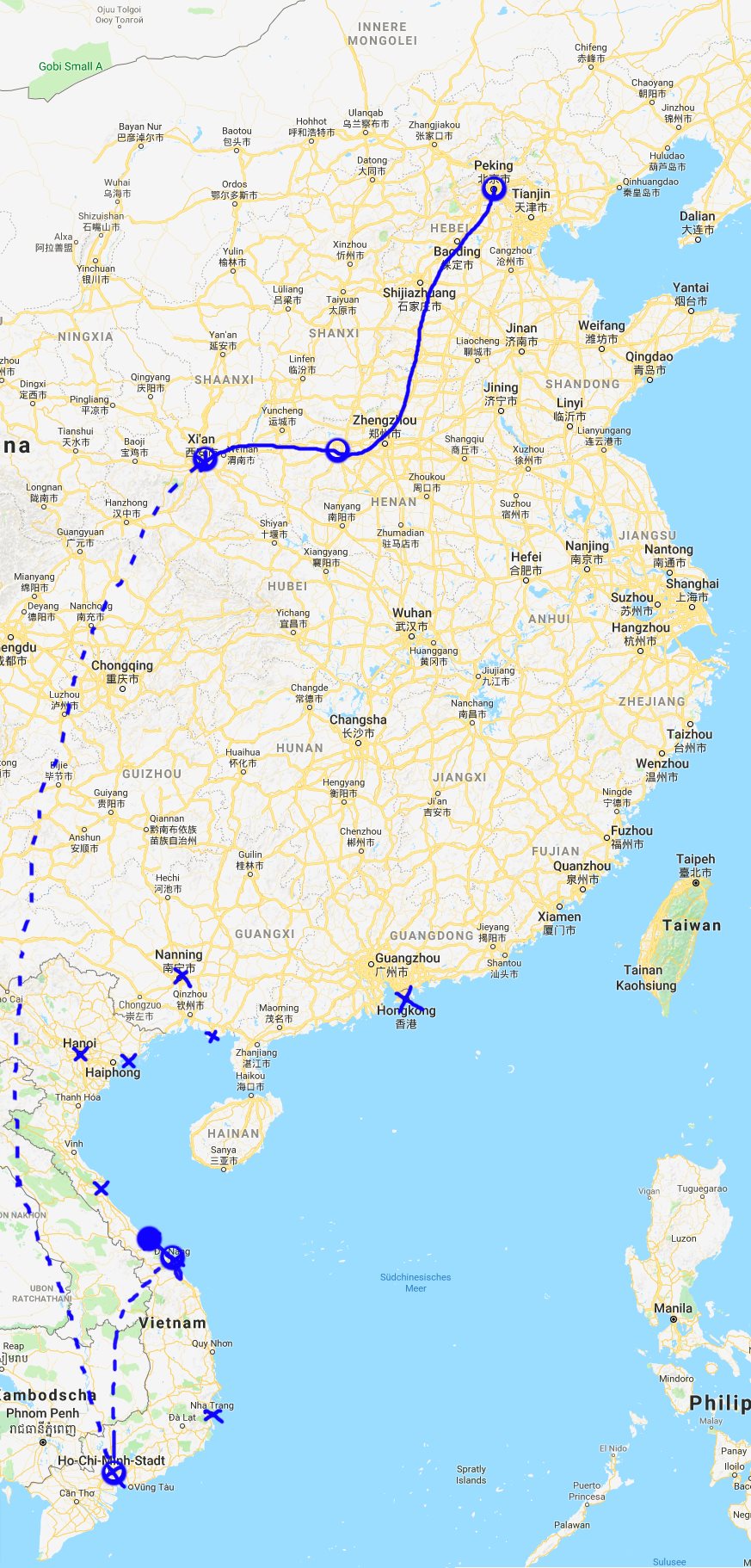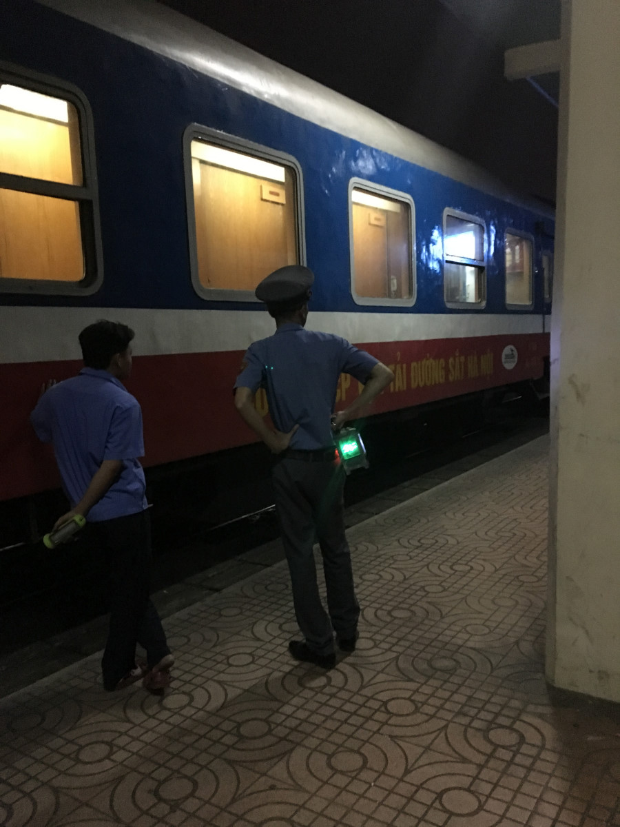 Allgemein lässt sich noch sagen: Übermäßige Geschwindigkeit zählt nicht zu den Eigenschaften der vietnamesischen Eisenbahn. Der Zug mit dem wir unterwegs waren ist ja, zumindest dem Namen nach, eine Expressverbindung zwischen Ho-Chi-Minh und Hanoi. Die Fahrgeschwindigkeit dürfte an den schnellen Passagen 80km/h kaum überschritten haben. Ausserdem wird an Bahnhöfen unglaublich lange angehalten. D.h 30-60 Minuten.