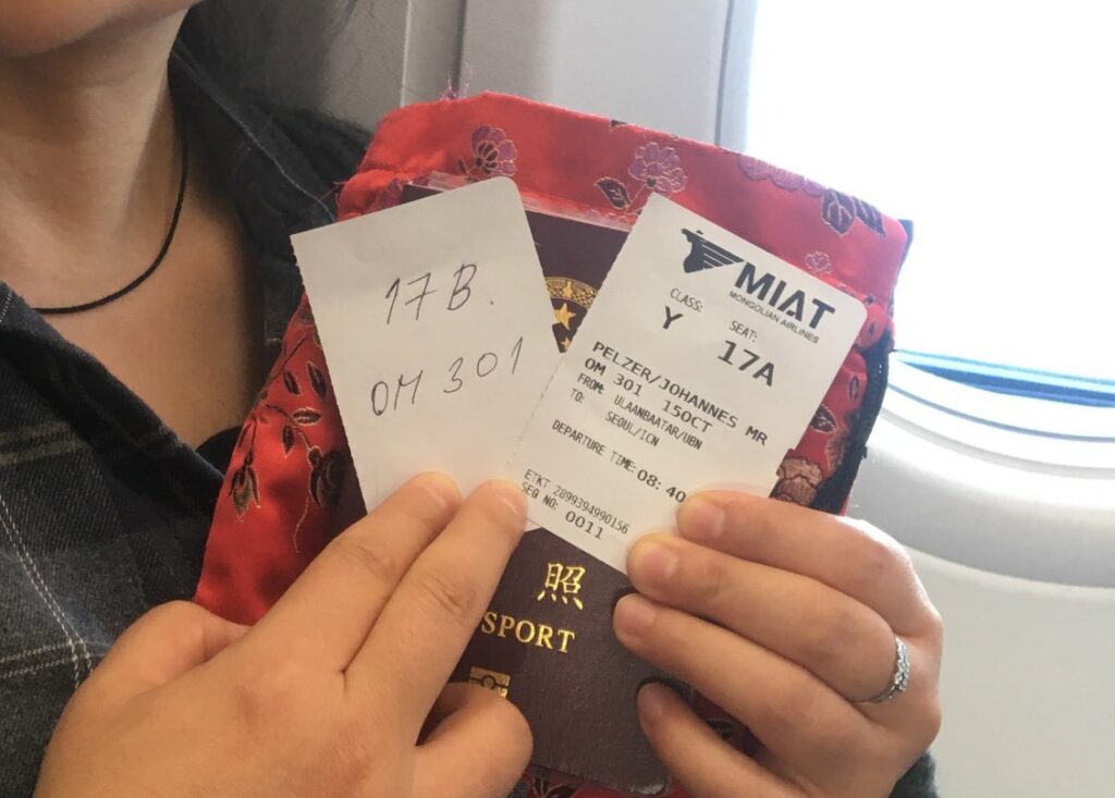 Etwas nervenaufreibend: Weder in Deutschland, noch in der Mongolei war das System dazu zu bringen eine Boardkarte für Beibei für den zweiten Teil unserer Flugstrecke auszudrucken. Was zu Beginn vom Personal noch als einfache Sache abgetan wurde, spitzte sich dann etwas zu, als alle anderen Passagiere schon im Fluzeug saßen, und das System maximal dazu zu bewegen war ein komplett leeres Stück Papier auszudrucken. 15 Minuten nachdem das Flugzeug eigentlich hätte starten sollen, wurde das Dokument dann handschriftlich angefertigt.